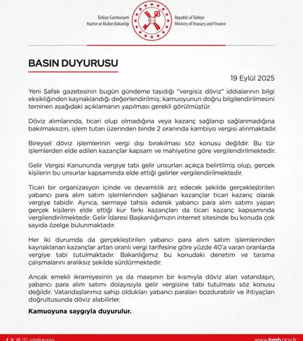 Hazine ve Maliye Bakanlığı, sosyal medya hesabından yaptığı paylaşımda, “Yeni Şafak gazetesinin bugün gündeme taşıdığı ‘vergisiz döviz’ iddialarının bilgi eksikliğinden kaynaklandığı değerlendirilmiş; kamuoyunun doğru bilgilendirilmesini teminen aşağıdaki açıklamanın yapılması gerekli görülmüştür” ifadelerini kullandı.